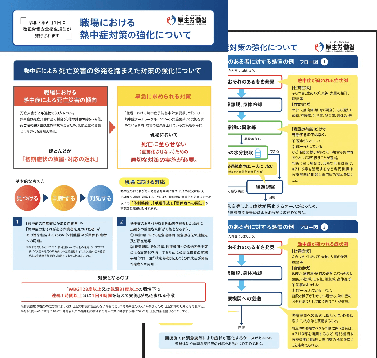 熱中症のおそれがある労働者を早期に見つけ、その状況に応じ、迅速かつ適切に対処することにより、熱中症の重篤化を防止するため、以下の「体制整備」、「手順体制」、「関係者への周知」が事業者に義務付けられます。